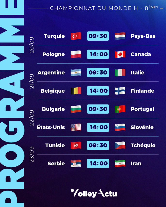 Après une semaine intense de compétition en phase de groupes du Championnat du monde masculin, disputée du 12 au 18 septembre, les équipes se sont battues pour terminer aux deux premières places de leur poule (composée de quatre équipes), synonyme de qualification pour les huitièmes de finale. Voici la liste des nations qualifiées pour la phase finale, accompagnée de leur classement mondial : Tunisie (33e), Pologne (1er), Argentine (8e), États-Unis (4e), Bulgarie (13e), Belgique (15e), Turquie (14e), Serbie (12e), Iran (16e), Pays-Bas (20e), Finlande (18e), Portugal (22e), Slovénie (6e), Italie (2e), Canada (9e) et Tchéquie (19e).